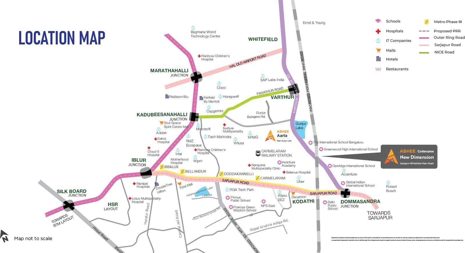 Abhee Codename New Dimension is located on the Varthur-Sarjapur Road in East Bangalore, specifically situated beside Greenwood High International School. It offers direct access to the Sarjapur-Whitefield corridor, making it a prime spot for IT professionals.